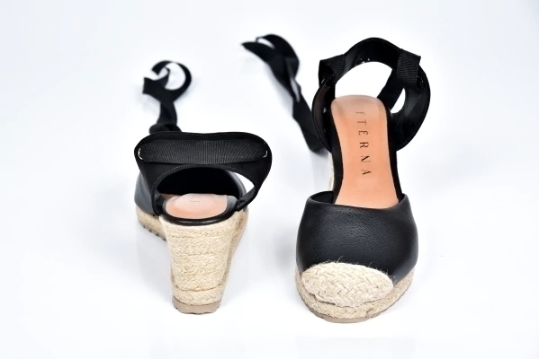 Espadrille em napa com salto anabela revestido em corda, com salto de 7 cm e uma pequena plataforma na frente com 1 cm, o que deixa a curvatura do pé com apenas 6 cm. Parte trazeira em camurça e fita de amarrar no tornozelo. Detalhe do bico em corda. Modelo atemporal e casual ideal para o dia a dia, vai bem tanto no inverno como no verão. Traz um ar feminino e delicado ao look.