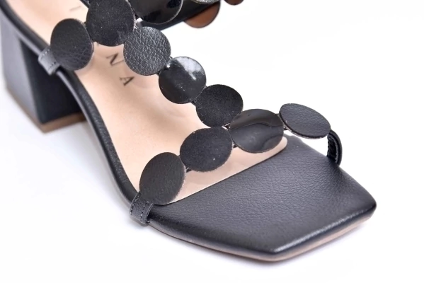 Sandália em napa com aplicação de diversas bolinhas em napa, verniz e camurça, para dar um charme a mais no seu pé. Possui uma tira transversal em cima do pé que traz muita estabilidade.Fechamento por fivela na lateral no calcanhar. Modelo moderno e requintado. Salto bloco médio 6 cm muito confortável. Versátil, combina com diversas ocasiões... trabalho, passeios em família, e festa! Ela não vai sair do seu pé!